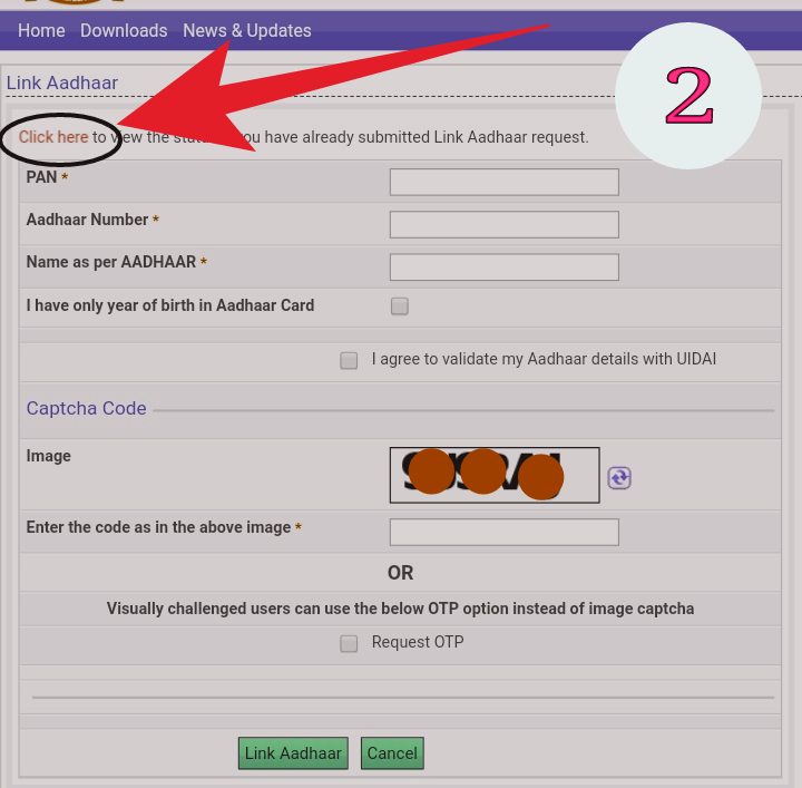 Step 4: మీ ఆధార్ కార్డు లింక్ అయిందో లేదో తెలుసుకోవడానికి. Click here adhaar card linking status అనే చోట క్లిక్ చేయండి. ఇక్కడ pan మరియు aadhar no. ఎంటర్ చేసి veiw link aadhar status పై క్లిక్ చేయండి. ఈ చిత్రం గమనించండి.